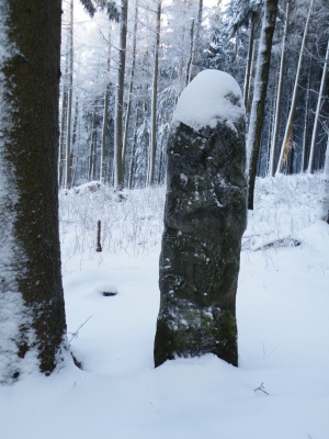 "Bühlheimer Großmutter", ein christianisierter Menhir in der Nähe der EGV-Hütte bei Lichtenau-Kleinenberg.