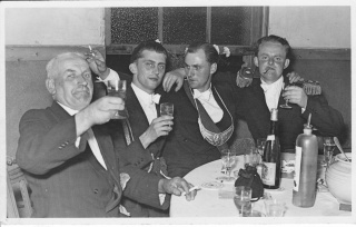 von links Josef Sudbrok (Strickers), Heinrich Drewes, König Josef Böhmer und Fritz Sasse (Cäsar)raucht Zigarre. 1955